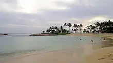 Ko Olina Beach Park is a public park on the west side of the island of Oahu, Hawaii within the Ko Olina Resort Community, part of the City and County of Honolulu. Located at the end of several high-end vacation resorts, the park is situated between the man made lagoon and the Ko Olina Marina. The park's white-sand lagoon is one of four in the 640-acre Ko Olina Resort. The water is well protected by the reef, relatively shallow and the beach bordered by a broad, grassy lawn.[1]