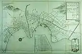 The site was located between the Ikuta River to the east, the Koi River (鯉川) (site of a future thoroughfare) to the west, the sea to the south, and the Saigoku Kaidō (西国街道) highway to the north.[2] It had an area of 78,000 tsubo (about 25.8 hectares),[3] and was developed based on a logical urban plan. For these reasons, it has been praised as the "best-planned foreign settlement in the Orient".[4] Its extraterritoriality was acknowledged in some of its administrative and financial affairs, and it was managed by an autonomous organization structured with foreign residents (most of whom had interests in east-India company and/or associates) at its center. Its operation was smooth, and relations between the Japanese and foreign sides were generally favorable.[5] The settlement prospered as a gateway to Western culture and base of trade, spreading its economic and cultural influence to the surrounding areas as well.[6]