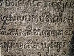 Several inscriptions were found which mention Koh Ker as capital of the empire in Siem Reap, Battambang, Takeo and Kampong Cham (city).[7] From inscriptions discovered at Koh Ker, it is estimated that more than ten thousand people lived at Koh Ker when it was the capital (928 – 944 AD). The inscriptions explain how manpower was organised: taxes in form of rice were raised in the whole country and served to provide for the workers who came from different provinces. An inscription at Prasat Damrei says that the shrine on the top of the state temple (Prang) houses a lingam of about 4.5 m (14 ft 9 in) and that the erection of this Shiva-symbol gave a lot of problems". A Sanskrit inscription at Prasat Thom gives evidence of the consecration of a Shiva-lingam 921 AD which was worshipped under the name of Tribhuvaneshvara ("Lord of the Threefold World").[1]:22