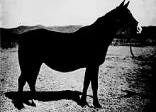 According to Bedouin traditions described by Wacław Seweryn Rzewuski, "Koheyléh" was one of the five mares who returned despite their thirst when the Prophet Muhammad pronounced their name.[6] He is said to have smeared their eyes with kohl, hence their name and that of their offspring, "Koheilan".[6] Koheilan horses are considered to be direct descendants of the Al Khamsa (الخمسة), Muhammad's five favorite mare lines,[4] which Bedouin nomads see as the origin of the Arabian breed, with the quality of belonging or not to the line being transmitted through the mother brood mare.[7][8] In fact, the names of these bloodlines often derive from the Bedouin family who bred them.[9] Orientalist Aleksander Chodźko notes that Koheilan are considered the finest Arabian horses.[10] Bedouin belief attributes to these horses the ability to choose the best path for their rider, thanks to hippomancy.[3]