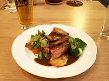 Fillet of beef in red wine sauce, with potato pancakes and vegetables, one of the most famous dishes in Kohvik Moon