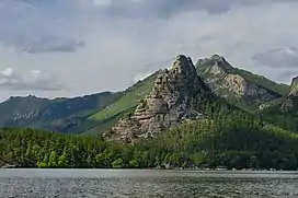 The Kokshetau Hills are a northern subsystem of the Kazakh Uplands (Saryarka), limited to the north by the West Siberian Plain. They are scattered across a vast area, with wide flat spaces in between of river valleys or lake basins. They stretch for about 400 kilometers (250 mi) between the Turgay Basin in the west and the Sileti valley in the east, with a width of 200 kilometers (120 mi) from north to south. The individual hills and hill clusters rise abruptly from the plains of the intermontane basins. They are generally rocky or have rocky outcrops at the top and there are bizarre rock formations as well.[2]