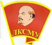 The Komsomol of Ukraine, officially the Leninist Communist League of Youth of Ukraine (Ukrainian: Ле́нінська Комуністи́чна Спі́лка Мо́лоді Украї́ни; Russian: Ленинская Коммунистическая Союз Молодые Украины), was a youth organization in the Ukrainian Soviet Socialist Republic under the Communist Party of Ukraine, a component part of the All-Union Lenin's Communist League of Youth (Komsomol).[1] It was first established in 1919 as the youth wing of the Communist Party (Bolsheviks) of Ukraine and later revived in 1997 as the youth wing of the modern Communist Party of Ukraine; that party was banned in 2015 and terminated in 2022.[2]