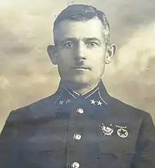A Russian, Konstantin Yefimovich Kulikov was born in a peasant family on 18 May 1896 in the village of Vitomovo, Yemalyanovsky volost, Staritsky Uyezd, Tver Governorate. He received a fourth-grade education at the village school, and worked on his father's farm.[1] In 1911 he began work as an apprentice roofer for a contractor in Saint Petersburg.[2] After World War I began, Kulikov was mobilized for military service in the Imperial Russian Army in August 1914 and sent as a ryadovoy (private) to the Novocherkassk Infantry Regiment. In a month, he volunteered to go to the front with a march battalion. On arrival, Kulikov and his battalion were absorbed into the Preobrazhensky Life Guards Regiment, positioned near Ivangorod. After graduating from the regimental training command in 1915, he received the rank of senior unter-ofitser in 1916, commanding a platoon. After the February Revolution, he became a member of the company and regimental committees. Kulikov was elected chief of a foot reconnaissance detachment, holding this position for the last two months of his service. Demobilized in November 1917, he returned to Petrograd.[3]