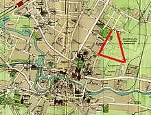 In the early 20th century, Bydgoszcz was called "Bromberg". A large distinct area developed east of the town centre. This area was delineated by Ossoliński Alley, Adam Mickiewicz Alley and Markwarta, Paderewskiego and Staszica streets. The area lay north of a Christian cemetery which became Ludowy Park, on Jagiellońska street.