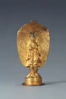 A single-mandorla triad, Hōryū-ji Dedicated Treasure no. 143 now in the possession of the Tokyo National Museum is a particularly fine example of Baekje sculpture in Japan from the 6th or 7th century.[42] The Korean origins of the statue are based on the round and warm faces typical of Baekje style, the absence of an air of solemnity and austerity typical of the Tori style, the casting technique which used nails instead of spacers, and the intaglio effect on the bronze the artisan used to make the eyebrows, a typical Korean technique. The Dainichibo standing Buddha, Sekiyamajinja Bodhisattva, Hōryū-ji Treasure no. 165 may all be from Korea as well.[43] Other possible examples of Baekje sculpture in Japan are the hidden image at Zenkoji (image),[44] the Kudara Kannon (literally Baekje Avalokiteshvara) at Hōryū-ji, and the Yumedono Kannon.