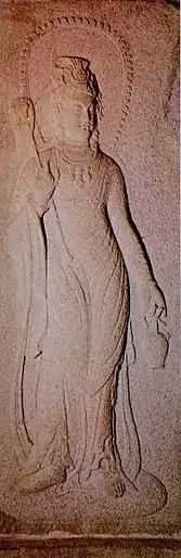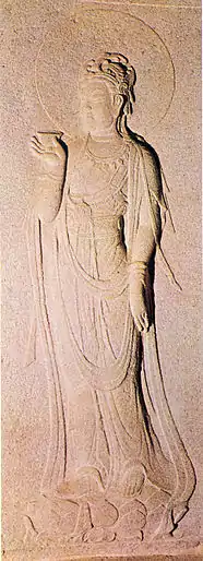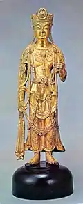 Many extant Baekje sculpture survive in Japan today. Horyu-ji Treasure no. 151 (image) is accepted by virtually all Japanese authorities to be of Korean origin[24] and was brought to Japan in the middle 6th century.[25] The four rectangular cavities in the back of the statue is a trait far more common in Korean than Japanese sculpture.[26] The image was probably used as a private devotional icon brought by Korean settlers. Hōryū-ji Treasure no. 158 (image), a pensive image is another image generally considered by Japanese scholars to be from Korea and is dated on stylistic grounds to the mid-6th century.[27][28] The Funagatayamajinja Bodhisattva, probably once part of a triad, has a crown with three flowers which was common early Three Kingdoms sculpture but not extant in Asuka sculpture. The image is believed to have originated in Korea.[29]