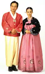 Many preparations go into celebrating the Korean New Year. During the first morning, Koreans pay their respect towards their ancestors. Traditional foods are placed on a table as an offering to the ancestors, and a rite begins with deep bows from all family members. This is a sign of respect and a very important practice on the first day of the New Year in Korea. It is also where they pray for the well-being of all the family members.[4] Many Koreans dress up in colourful traditional Korean clothing called hanbok, usually worn for special occasions such as weddings, Korean New Year, child's first birthday, amongst others.[4] However, with modernization and evolving mores in the culture, more people tend to prefer westernized, modern clothing to the hanbok. After the rite, the members have a big feast.