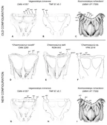 In 2011 and 2014, Longrich found the sole species of Vagaceratops to be retained in Chasmosaurus, where it had been placed originally (as C. irvinensis), while Kosmoceratops did not cluster closely with other taxa.[22][6] In his 2015 article that failed peer review, Longrich argued that the similarity between the neck frills of the two was due to convergent evolution, stating that the ten epiossifications on the back of the frill of C. irvinensis (or Vagaceratops, which he by then conceded could be a distinct genus) were located on the parietal bones but were located on both the parietal and squamosal bones in Kosmoceratops (Sampson and colleagues stated that they were located on the parietal and squamosals in both).[15] In a 2014 Master's thesis, Campbell stated that Sampson and colleagues had initially identified all ten epiossifications on the hind margin of the frill of the adult Kosmoceratops as epiparietals, before realizing that only six of them were epiparietals after examining the subadult specimen, where the sutures between the parietal and squamosal bones were more evident (sutures fuse and become less apparent with age). Sampson and colleagues had therefore also reinterpreted the pattern of epiossifications in Vagaceratops similarly, but Campbell suggested that it had four or five epiparietals instead, therefore finding it to be the sister taxon to Chasmosaurus rather than Kosmoceratops.[23] Campbell and colleagues also found Vagaceratops to be more closely related to Chasmosaurus than Kosmoceratops in 2016,[16] and in 2019, they considered V. irvinensis to be a species of Chasmosaurus.[24]