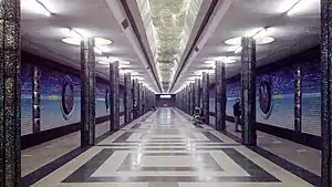 Kosmonavtlar ("Cosmonauts", formerly known as Проспект Космонавтов, Prospekt Kosmonavtov) is a space-programme-themed station of the Tashkent Metro.[1] It honors Soviet cosmonauts such as Yuri Gagarin and Valentina Tereshkova, the first man and woman in space.[2] The station was opened on 8 December 1984 as part of the inaugural section of the line, between Alisher Navoiy and Toshkent.[3]