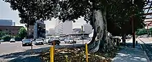 The first established site was a storefront in 1912 near Elysian Park. In 1920, the temple was moved to a larger building on Central Avenue. A tree was planted in front of the new building by Koyasan Temple members to commemorate the move. The Aoyama Tree is a 60 by 70-foot Moreton Bay Fig tree (Ficus macrophylla) and notable landmark in Little Tokyo was given historical status by the Los Angeles City Council in 2008.[5] However, currently this tree faces a great threat of decades of neglect. After the former temple building was demolished, the tree was left without an irrigation system with the area immediately surrounding the tree was paved over, covering the tree's extensive roots system, denying the tree essential water.[5]