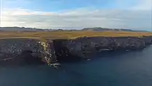 A jeep track runs down to the sea from Krýsuvík and Route 427. It ends at the high cliffs of Krýsuvíkurbjarg [ˈkʰriːsʏˌviːkʏrˌpjark] or Krýsuvíkurberg [-ˌpɛrk] which are renowned as bird cliffs with thousands of Icelandic sea birds like arctic terns, puffins, fulmars and more.[3] About 63,000 pairs of birds were counted there shortly before 2014. But the cliffs, which can be reached on foot, are also a window in the geologic past.[10] The lava flows covering the area came mostly from the crater up on Geitahlíð tuya, not from the Krýsuvík, but from the neighbouring Brennisteinsfjöll volcanic system. The area is protected as part of Reykjanesfólkvangur.[11]