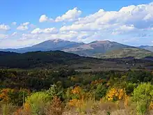 The highest summit of Kraishte is the Besna Kobila mountain in Serbia (1,922 m); the border mountain of Karvav Kamak includes the highest point of the region in Bulgaria, Bilo (1,737 m).[2] The Bulgarian part of the region includes 23 small mountain ranges in two grouping: the Ruy-Verila range encompassing Miloslavska planina (1,485 m), Ruy (1,706 m), Ezdimirska Planina (1,219 m), Strazha (1,385 m), Lyubash (1,398 m), Bohovska planina (1,318 m), Karvav Kamak (1,737 m), Leshnikovska Planina (1,086 m), Elovishka Planina (1,329 m), Penkyovska Planina (1,187 m), Lyulyak (1,324 m), Erulska Planina (1,481 m), Cherna Gora (1,129 m), Golo Bardo (1,158 m) and Verila (1,415 m) and the Milevsko-Konyavska range consisting of Milevska planina (1,733 m), Izvorska Planina (1,243 m), Kobilska Planina (1,356 m), Chudinska Planina (1,497 m), Lisets (1,500 m), Zemenska Planina (1,295 m), Rudina Planina (1,172 m) and Konyavska Planina (1,487 m).