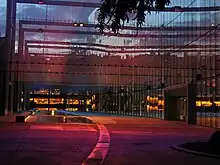 Kreielsheimer Promenade has been described by the Seattle Post-Intelligencer as "an appealing indoor garden on the ground level and a series of towering metal scrims overhead onto which fields of color [are] projected, primarily on performance nights".[5] The American Institute of Architects describes the promenade as a pedestrian corridor and a "subtly undulating, brightly lighted open space between two campus buildings".[6]