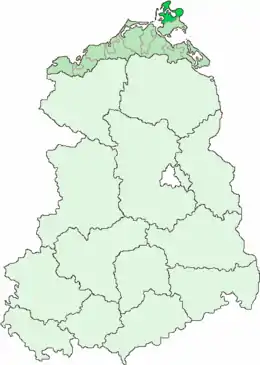 Kreis Bergen covered the northern part of the island of Rügen including the islands of Hiddensee and Ummanz off its coast and the peninsulas of Bug, Jasmund, Schaabe and Wittow. Within the county were the town of Bergen itself and the municipalities of Altenkirchen, Boldevitz, Breege, Buschvitz, Dranske, Dubnitz, Gingst, Glowe, Groß Kubitz, Hiddensee, Karow, Kluis, Lieschow, Lietzow, Lohme, Lubkow, Neuenkirchen, Parchtitz, Patzig, Putgarten, Ralswiek, Rappin, Sagard, Saßnitz, Schaprode, Thesenvitz, Trent, Ummanz, Wiek and Zühlitz.[2]