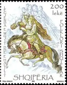 Two types of female warriors/active characters appear in Albanian epic poetry, and in particular in the Kângë Kreshnikësh: on the one hand those who play an active role in the quest and the decisions that affect the whole tribe; on the other hand those who undergo a masculinization process as a condition to be able to participate actively in the fights according to the principles of the Albanian traditional customary law, the Kanun.[15] The dichotomy of matriarchy and patriarchy that is reflected by the two types of female warriors in Albanian epic poetry might be connected with the clash between Pre-Indo-European populations—who favored 'Mother Earth Cults' comprising earthly beliefs, female deities and priesthood—and Indo-European populations who favored 'Father Heaven Cults' comprising celestial beliefs, male deities and priesthood.[16]