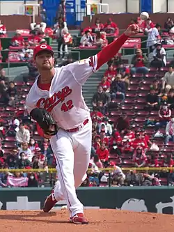 After beginning the 2016 season strongly, Johnson signed a three-year extension in June to remain with the Hiroshima Toyo Carp beyond the current year.[18] On October 24, 2016, Johnson became the first foreign pitcher since Gene Bacque in 1964 to win the Eiji Sawamura Award following a season including a 15-7 record, a 2.15 ERA and 141 strikeouts in 180+1⁄3 innings.[19][20]