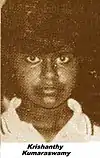 Krishanti Kumaraswamy (Tamil: கிருஷாந்தி குமாரசுவாமி), also spelled Krishanthi Kumaraswamy, was a Tamil woman in Sri Lanka who was raped and murdered on 7 September 1996 by six Sri Lankan Army soldiers; the effort to bring her assailants to justice became a cause célèbre as a part of the protest against atrocities committed by the Sri Lankan Army during the Sri Lankan Civil War.