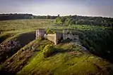 The ruined Kudryntsi Castle (Ukrainian: Кудринецький замок, Kudrynets'kyi zamok, Polish: Zamek w Kudryńcach) is perched on a hilltop overlooking the Zbruch River in Chortkiv Raion, Ternopil Oblast, Ukraine, 25 km west of a larger fortress in Kamianets-Podilskyi. It was built in the early 17th century by Jan Szczęsny Herburt and throughout the ensuing century was subjected to repeated sieges by the Cossacks and the Turks. By the 19th century, some portions of the walls had crumbled away, and the structure was left to its fate.