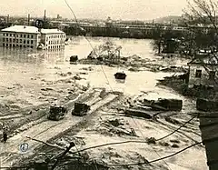 The mudslide started when a dam securing the loam pulp dump of a brick factory near the Babi Yar ravine collapsed after rain, releasing large volumes of pulp sludge, mud, water, and human remains down the steep hill of the modern Olena Teliha Street and into the streets of Kyiv. The slide immediately hit the lower-lying Kurenivka neighbourhood, reaching a residential area, a tram depot, several industrial buildings and a cemetery, as well as traffic moving along the streets. The total volume of pulp in the vicinity of Kyrylivska-Novokostiantynivska streets was up to 600,000 cubic metres (21,000,000 cu ft) with a depth of up to 4 metres (13 ft). While the contemporaneous official report indicated only 145 fatalities, a more recent study estimated that about 1,500 people died in the tragedy.[1][2]