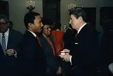 In February 1996, Mfume left the House to accept the presidency of the National Association for the Advancement of Colored People (NAACP), saying that he could do more to improve American civil rights there than in Congress.[6] He reformed the NAACP's finances to pay off its considerable debt while pursuing the cause of civil rights advancement for African Americans. Though many in Baltimore wanted Mfume to run for mayor in the 1999 election, he stayed with the NAACP.[7]