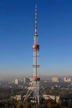 The Kyiv TV Tower (Ukrainian: Телевізійна вежа, romanized: Televiziyna vezha) is a 385 m-high (1,263 ft) lattice metal tower[1] on Oranzhereina Street, Kyiv, Ukraine, and is the tallest structure in the country.[2] The tower was built in 1973 while Kyiv was the capital of Ukrainian SSR.[3] The tower was the tallest freestanding metal structure in the world[1][2] It is used for radio and television broadcasting and is not open to the public.[1]