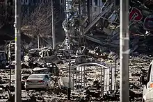 On 20 March 2022 around 10:45 pm, the Retroville, a shopping centre located in Kyiv, Ukraine, was bombed in a Russian airstrike. Part of the mall along with its 12-storey business center were destroyed. At least eight people were killed, six of whom were dressed in military fatigues.[1] According to the Russian government, the shopping centre was used as a cover to store and reload ammunition, including the BM-21 Grad multiple rocket launchers by Ukraine.[2]