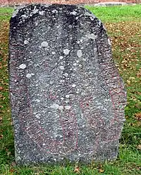 Of the names in the inscription, Þorkell is a diminutive form of Þorketil, which includes as a theophoric name element the Norse pagan god Thor and means a "Vessel of Thor" or "Kettle of Thor", possibly referring to a type of sacrificial cauldron.[4] The Poetic Edda poem Hymiskviða includes a story of Thor fetching a large cauldron to brew ale. The name Þorbjôrn also refers to the Norse god and translates as "Thor Bear".[5] Although the names may refer to Norse pagan gods, this does not indicate any belief as the inscription clearly indicates a Christian faith with its cross.