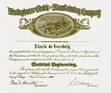 He attended the Pestian Graduate Grammar School and then earned a mechanical engineering diploma at the Royal József University in 1906. After completing his university years, he spent a short time working in Germany and England. He then obtained employment at the Westinghouse Electric and Manufacturing Company in Pittsburgh, USA. Here he worked as a workshop trainee for two years and as a group leader for another two years. He participated in the training organized by the factory. After completing this, in 1909 he passed an examination and obtained an electrical engineering diploma. For a short time he worked at the factory's design department and then returned to Europe.