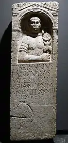 The man sits before an imitation parapet with three sets of painted inscriptions, each rendered to look as if chiselled or scratched into stone.[3] Van Eyck did not have full command of either classical Greek or Latin and made errors, so readings by modern scholars vary. The first inscription is in Greek and seems to spell "TYΜ.ωΘΕΟϹ", which has not been satisfactorily interpreted but has led some to title the work Timotheus. The middle reads in French "Leal Souvenir" ("Loyal Memory") and indicates that the portrait is a posthumous commemoration. The third records van Eyck's signature and the date of execution.[4] The 19th-century art historian Hippolyte Fierens-Gevaert identified the lettering "TYΜ.ωΘΕΟC"[5] with the Greek musician Timotheus of Miletus. Panofsky drew the same conclusion, eliminating other Greeks bearing the name Timothy; they were of religious or military background, professions that do not match the civilian dress of the sitter. Panofsky believed the man was probably a highly placed musician in Philip's court, possibly Gilles Binchois.[6]