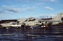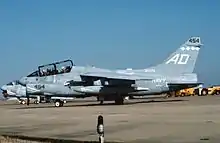 During 1967, the Navy decided to cancel its order for the A-7B, resulting in 257 aircraft less of this variant being constructed.[7] Taking its place, the A-7E, the definitive model of the aircraft, was specified and placed into production. This variant integrated several of the improvements of the USAF's A-7D, including the TF41 engine and much of its avionics; however, the engine was revised for slightly more thrust and the communications modified for compatibility with naval systems.[10] On 25 November 1968, the first A-7E conducted its first flight; a total of 535 aircraft of this variant would be manufactured.[11] During the 1970s and 1980s, several specialised models, such as the TA-7C for training and EA-7L for electronic warfare, were developed as well.[12] During 1983, the final delivery of a new-build A-7 took place.[1]