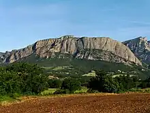 ![]() The multi-coloured cliff of the Contrafort de Rumbau; La Dura Dura is situated on the long-bright blue streaks near the centre of the cliffs. | |