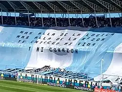 During the dark days of the football team, the fans played a fundamental role in avoiding bankruptcy. On March 7, 1999, after a judge decreed that the club's assets didn't exist, Racing fans gathered at the stadium as an act of protest.[4][5][6][7] The same year, they built a training center for the youth association football players who were playing in swamps[8] and they prevented a Racing venue from being auctioned off, fighting against the Argentine police forces.[9][10]