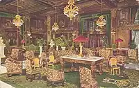 The hotel's Main Lobby was dramatic and opulent with green and gold decorations, carrying the theme through its carpets and drapes. It was furbished with marble throughout: floors, statues and a desk. Accents included brass fixtures and spittoons. There were over-sized, upholstered chairs, as well as shorter ones for women and children.[20]