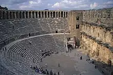 The first live performance Shakira gave for "La Tortura" was on the German television show Wetten, dass..?, filmed in the ancient Roman amphitheater of Aspendos, near Antalaya, Turkey, and aired on 15 May 2005.[75] She then went to the United States and gave performances for the track on MTV's Total Request Live, on 31 May and on Good Morning America, three days later.[76][77] Shakira and Sanz sang the song together for the first time at Madrid bid for the 2012 Summer Olympics on 5 June 2005.[78] A few days later, on 20 June, she performed the single during UNICEF's 50th anniversary in the Netherlands.[79] Shakira was also part of the MTV Day festival in Madrid, Spain which took place on 29 June 2005, performing "La Tortura" and "No", another song from Fijación Oral Vol. 1, among other songs from her back catalog.[80] On 2 July, she appeared at Palace of Versailles in Paris to sing "La Tortura" and "Whenever, Wherever" as part of the Live 8 benefit concert.[81] Days later, she went to Argentina and gave a performance of "La Tortura" on her own television special titled Shakira: Íntimo, aired by Telefe.[82]
