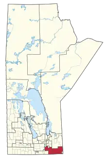 Communities in the riding include Buffalo Point (and Buffalo Point First Nation), Gardenton, Grunthal, Kleefeld, La Broquerie, Marchand, Middlebro, New Bothwell, Otterburne, Piney, St. Malo, St-Pierre-Jolys, Sarto, Sprague, Stuartburn, Sundown, Vassar, Vita, and Woodridge.[2] The Lake of the Woods' Buffalo Bay is also in the riding.[4][2]
