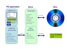 The PC host application controls the data location of the regular user data, including the structure of the file system. In the host application the user label input is transformed into a bit-map representation. The host sends print commands with the pixel information of the image to the drive. The drive interface, records the regular data, including lead in, session intros and closures, and finally lead out. The drive Interface (IF) part takes care of the interpretation of the pixel information and location of the image on the disc. The drive Servo part finally records the pixel information on the correct location including the encoded line numbering. The drive Servo part controls the record power, motor frequency, pixel frequency and channel bit frequency.