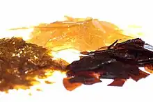 The word Lac is derived from the Sanskrit word lākshā' (लाक्षा) representing the number 100 thousand, which was used for both the Lac insect (because of their enormous number) and the scarlet resinous secretion it produces that was used as wood finish, lacquerware, skin cosmetic, ornaments and dye for wool and silk in ancient India and neighbouring areas.[2][3] Lac resin was once imported in sizeable quantity into Europe from India along with Eastern woods. These were being used very widely.[4][5]