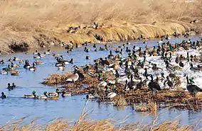 Since the late 1950s, 281 species of birds have been recorded at the refuge. During the spring and fall migratory periods, as many as 29,000 ducks and 37,000 geese have been observed. About 80 and 100 trumpeter swans spend the winter at the refuge each year. The endangered whooping crane and the bald eagle live in the area. Other raptors such as the red-tailed hawk, Swainson's hawk, northern harrier, American kestrel, great horned owl, and golden eagle can be seen. The introduced ring-necked pheasant is abundant.