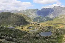 ![]() Lakes of Morgon (Tinée, French Alps). Left: the Big Lake of Morgon (2427 m) ; center: the Median Lake (2470 m) and the Higher Lake (2480 m). | |