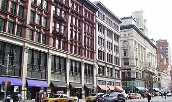 Before becoming a shopping district, this area was residential and included rows of identical brownstone townhouses.[6] These townhouses were replaced in the 1860s by department stores. The architectural style of this district shifted to Beaux-Arts, Neo-Renaissance, Romanesque Revival, and Queen Anne.[7] Many of the new buildings used cast iron because it was cheap and could be made into any shape for extravagant decorations.[6] The first to make this move was Arnold Constable in 1868, though other were quick to follow.[7] The area first came to prominence in 1860, when the Prince of Wales stayed at the Fifth Avenue Hotel, located on the corner of Fifth Avenue and 23rd Street, signalling to New York's high society that the neighborhood was acceptable to royalty.[2] Between the Civil War and World War I, the district was the location of some of New York's most famous department stores and upscale retailers, including B. Altman, Best & Co., Arnold Constable, Bergdorf Goodman, Gorham Silver, W. & J. Sloane, Lord & Taylor, and Tiffany & Co.[8][2] The Ladies' Mile also boasted upscale restaurants, booksellers and publishers, and offices and showrooms for piano manufacturers, such as in the Sohmer Piano Building. Performance venues in the district included the Academy of Music and Steinway Hall; the first location of the Metropolitan Museum of Art was there as well.[2]