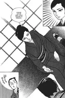 In chapter 2, Lady Snowblood is hired to assassinate Jinba, a brothel owner and find out what makes his brothel so popular. She starts a fire on one of Jinba's buildings before helping to put it out to gain his trust. Upon learning the brothel's popularity is in a lesbian sex show, she kills Jinba. In chapter 3, a child is born in a women's prison. The mother suffers terribly while giving birth but before dying, she tells the tale of how her husband and son were murdered and she was brutally raped. She escaped their clutches by killing one of her tormentors, Tokuichi Shoei, but was caught by the police and sentenced to life imprisonment. This child, Oyuki, is cursed to carry out the vengeance her mother was unable to. This is where the reader learns Lady Snowblood's true name. In chapter 4, Oyuki is given a contract to slay Kotozo Shimaya, who runs a rickshaw business which preys on unaccompanied women. In chapter 5, Oyuki learns the skills of a pickpocket from an inmate friend of her mother. Using her newly acquired skills, she slays two women and two men and she frames corrupt high-ranking officials into shutting down a rokumeikan (Social Hall), which was for the westernization of Japan. | ||||