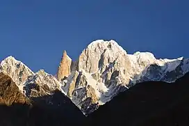 The Bublimotin, Bubli Motin, Bublimating or Ladyfinger Peak (Urdu: لیڈی فنگر), is a distinctive rock spire in the Batura Muztagh, the westernmost subrange of the Karakoram range in Pakistan. It lies on the southwest ridge of the Ultar Sar massif, the most southeasterly of the major groups of the Batura Muztagh. The whole massif rises precipitously above the Hunza Valley to the southeast.