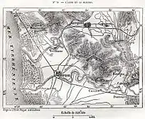 The lake lay in a broad valley between two sets of hills, the Monte Pisano to the west and the Monte Carlo to the east. From antiquity, Lago di Bientina had two sections – a large area of permanent water towards the north, known as the Chiaro, and a marshy area towards the south that drained in the dry season, known as the Padule.[1][2] Due to the shallowness of the valley, Lago di Bientina's size varied widely from season to season, from 16 km2 (6.2 sq mi) during times of severe drought to 96 km2 (37 sq mi) during floods.[2] At its average area of 36 km2 (14 sq mi), it was the largest lake in Tuscany.[3]