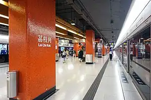 Lai Chi Kok (Chinese: 茘枝角) is a rapid transit station on the Tsuen Wan line of the Hong Kong MTR system, between Cheung Sha Wan and Mei Foo stations. It was opened on 17 May 1982.
