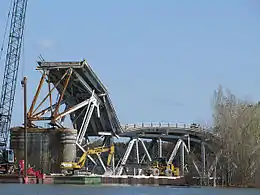 On November 9, 2009, officials in Vermont and New York announced that the bridge was beyond repair and would have to be demolished.[12] Removal of the existing bridge was accomplished by explosive demolition, and was originally scheduled for December 23, 2009.[13] On December 22, officials moved the demolition date to December 28 as a result of the formation of ice on Lake Champlain and cold weather in the area; both factors led to delays in installing the necessary explosives for demolition.[14] The bridge was demolished at 10:03 am on December 28, 2009.[15]