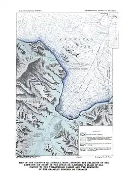 Ice of the Keewatin Lobe of the Laurentide Ice Sheet advanced westward into the Missouri and Yellowstone river valleys. The Glasgow sublobe blocked the Missouri River west of present-day Fort Peck, Montana, and created Lake Jordan and glacial lakes Circle and Lambert were formed to the east. The Yellowstone lobe spread south past Intake, Montana, and formed glacial Lake Glendive. At its maximum the ice may have blocked the Little Missouri River forming glacial Lake Mikkelson.[2] When the ice sheet began to retreat northward, the southwestern margin of abandonment its previous drainages and lakes formed in the depression along the ice margins. Melting of the Shelby and Havre lobes in western Montana led to the retreat of the ice into Alberta. By 16,200 B.C. the ice had created glacial Lake Carmichael in the area of the Cypress Hills. By 15,700 B.C. ice-free conditions may have existed in southwestern Saskatchewan north of Havre, Montana.[3]