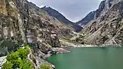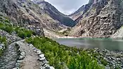 The lake is located 2 km (1.2 mi) away from the Kharfaq village and is around a 3-hour hike. There is no road access to the lake, but a road has been under construction for a while but has not been completed due to a lack of funds.[1]