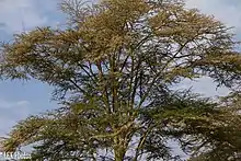The park has a variety of diverse habitats. Rivers flowing off the escarpment and perennial springs below the rift wall support tall, evergreen groundwater forests dominated by Trichilia roka with Broad-Leaved Croton (Croton macrostachyus), sycamore fig (Ficus sycomorus), quinine tree (Rauvolfia caffra) and forest toad-tree (Tabernaemontana ventricosa).[6] Trees are densest in gorges, along the edge of streams and in areas where springs emerge.[13] Growing at the edge of the groundwater forest are dense stands of yellow fever trees (Acacia xanthophloea) and the palm Phoenix reclinata.[6] The flora of Lake Manyara National Park is diverse, with over 670 flowering plant and fern species documented. Most are widespread species; there are few rare or endemic species.[15]