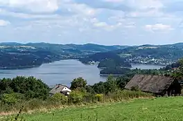 Lake Rożnow (Polish: Jezioro Rożnowskie) is an artificial lake, built in 1935–1941. It is located in southernmost part of Poland (Lesser Poland Voivodeship). The lake was built in the interwar period to regulate the Dunajec river flowing through the foothills of Beskid Mountains; and also, to provide electricity for the Rożnow Power Plant (Elektrownia Rożnow) built into the dam. The lake took two years to fill which took place during World War II, from mid 1941 until 1943. It was named after the village of Rożnow.[1]